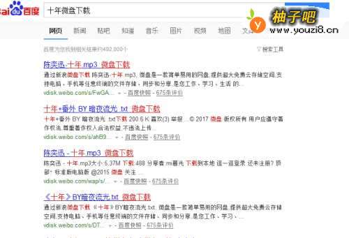 3现在我们关闭网易财三董云音乐,打开百度一下网页,在搜索引擎中暗腊输入你要下载的歌曲名称,再在歌曲名称后面添加“微盘下载”四个字,例如:十年微盘下载。点击百度一下,再点击列表中的第一个链接。