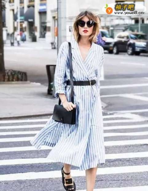 6衬衫裙可以敞开或半敞开穿。在敞开穿的时候,衬衫裙的作用就相当于衬衫了,里面可以搭配短裙,铅笔裤等等。半敞开穿时就需要系腰带了,里面可以搭配T恤,下身穿烟管裤,就很有职场女性的风格特点了。