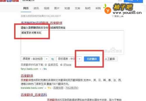 4我们找到百度翻译,然后输入“闻官军收河南河北”并点击按钮“百度翻译”,如图