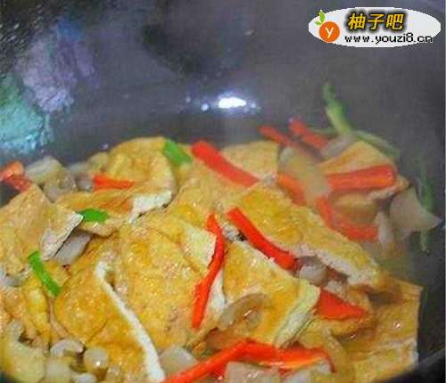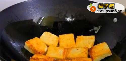 22.接着把豆腐片入油锅小火煎至两面金黄。