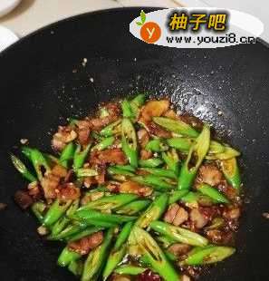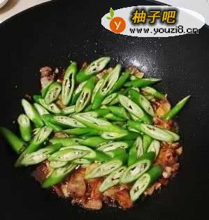 5肉片均匀上色后向锅内放入切好的青椒段或片,开大火,炒30秒左右。
