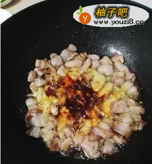 4炒出蒜香味后,加入一勺豆瓣酱,继续进行翻炒。