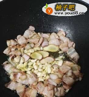 3当五花肉低宋糟片颜色泛黄时,下入准备好的姜片和蒜片,继救迅续煸炒。