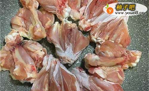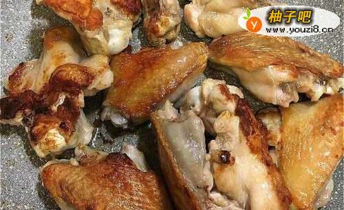 2锅里放油加热,排入腌过的鸡翅,皮面朝下,小火将鸡皮煎焦黄。翻面续煎,将鸡翅煎熟。