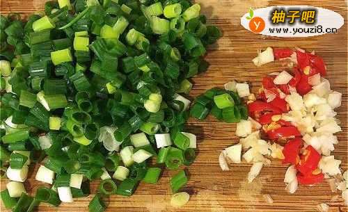 3煎鸡翅时将洗净的葱蒜辣椒切末备用。