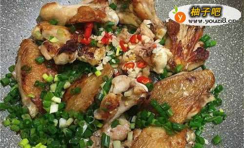 用辣椒、葱、蒜干煎鸡翅,香辣又脆皮的鸡翅非常好吃。
