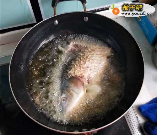 6油温升上来之后,将鱼放入。一锅炸不开,可以分两次炸。