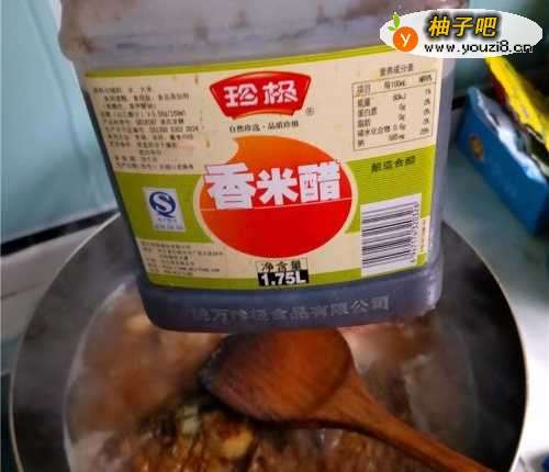 14放入醋。我家里只有米醋,米醋味差些,不如陈醋。然后盖盖等锅沸腾
