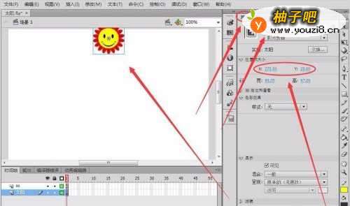 2选中“太阳”元件,在“属性”面板中,将x坐标改为275,y坐标改为25,元件的“实例名称”取名为sun_mc。