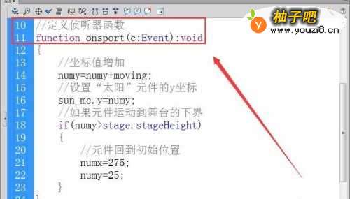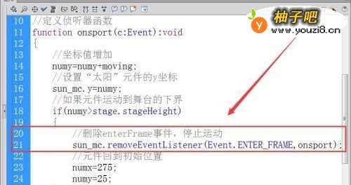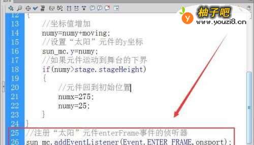 7注册“太阳”元件enterFrame事件的侦听器,接收者函数为onsport。