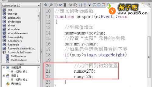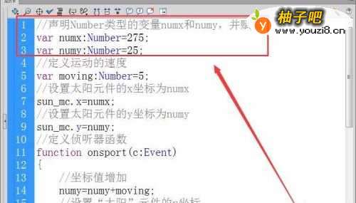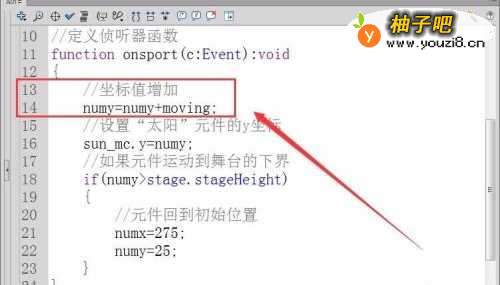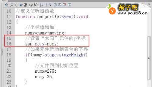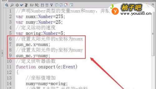 10设置“太阳”元件的y坐标值为numy,代码如下图所示。