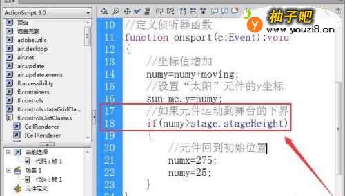 11用if语句判断“太阳”元件是否已到达舞台的最下部,即用numy的值是否大于舞台的下边界stageHeight来判断是否已到最下面,如果条件成立则执行下面的语句。