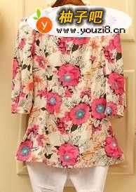 6圆领,大朵红色花显气色红润,立体腰身裁剪,很收身,搭配条休闲裤