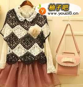 3娃娃的领子,黑白毛线钩花镂空,蝙蝠袖独特的设计,下摆波浪形钩花,下面搭配短裙或短裤都很不错