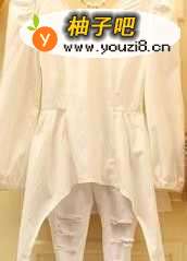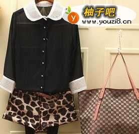 2荷叶边翻领的长袖翻领衫,显得复古清新,衣身很有垂感,领口和袖边的黑色雪纺荷叶边,搭配件黑色的短裙,短裙上有些白色蝴蝶结的点缀显得特别清秀