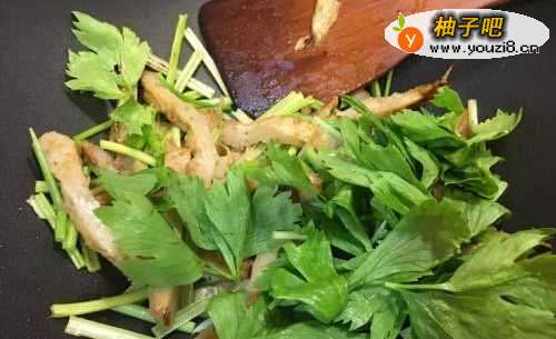 4起锅前下芹菜叶,翻炒均匀即可盛盘