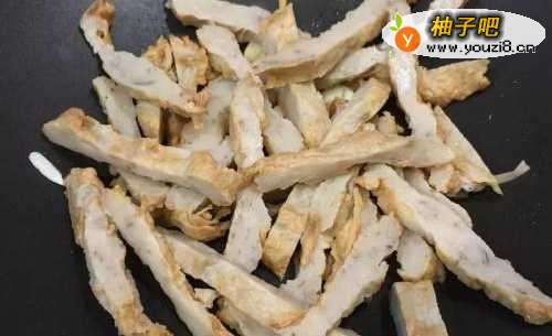 2蒜头爆香后将甜不辣下锅,煎至金黄