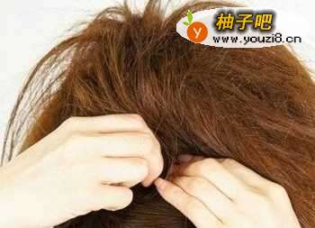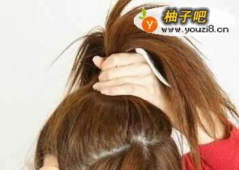 第一步:首先女生将刘海与耳朵前方的发丝向前梳理,与后面的中长直发分离开,将后方的中长直发梳理光滑,在发旋的位置聚集在一起。