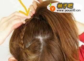 3第三步:将右边耳朵前方的发丝编织成细细的麻花辫,直至发尾,向后拉至马尾辫的扎发处,用发卡固定住,左耳前方的发丝进行同样的处理步骤。