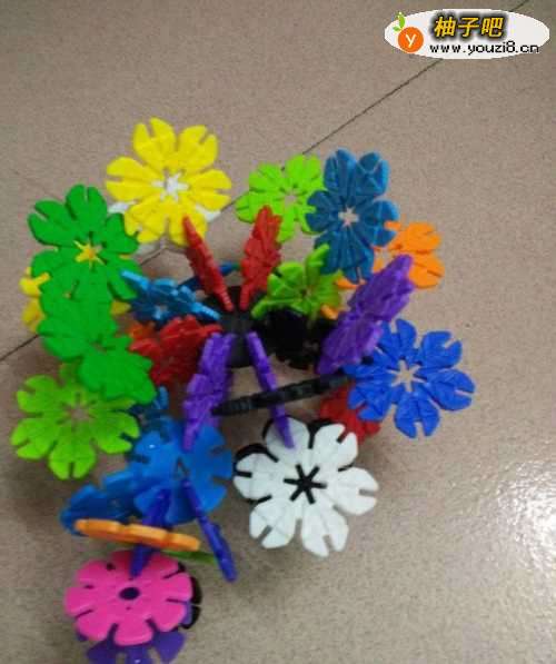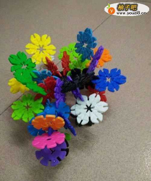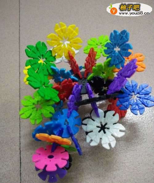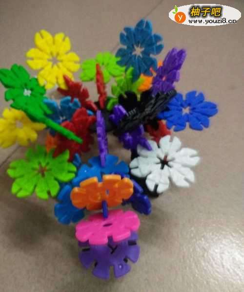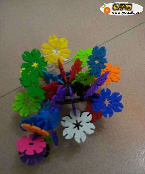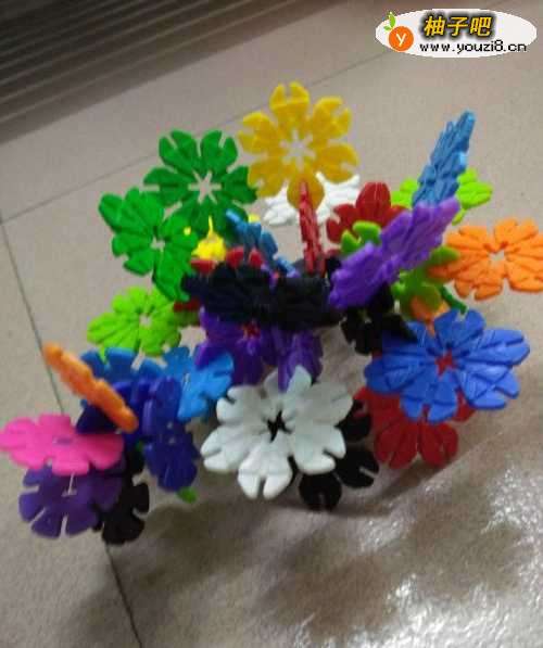 6用2片雪花片拼接成刺猬的两个耳朵。瞧,一只漂亮的活灵活现的刺猬就做成了。宝宝的杰作哦。多可爱呀。