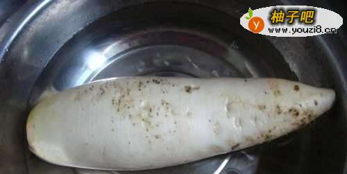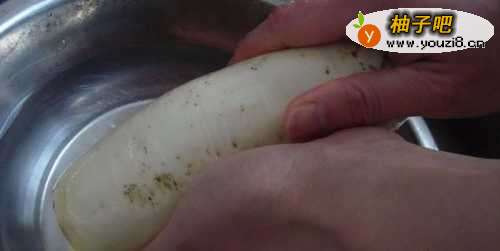 2接着,用手把白萝卜的外表,用水洗干净,如下图所示。