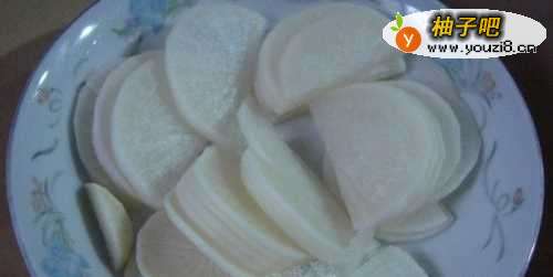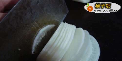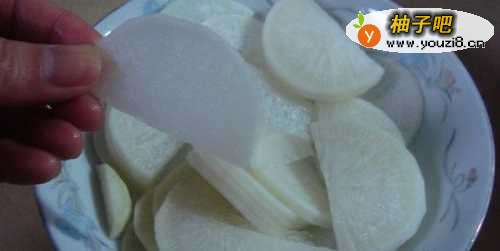 5然后,左手按在白萝卜的上面,右手拿刀在白萝卜上,斜切出一片片的白萝卜,如下图所示。