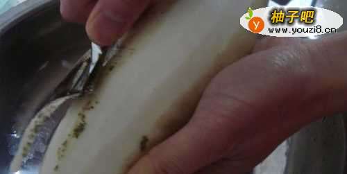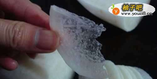 3然后,用刮子把白萝卜的表皮刮去,如下图所示。