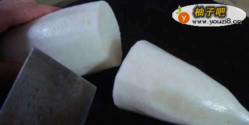 4接着,把白萝卜洗干净,放在案板上,切分成两半,如下图所示。