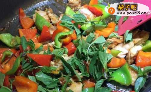 6再加入九层塔拌炒一下,起锅前淋上香油及锅边醋即可
