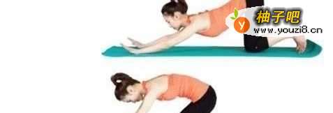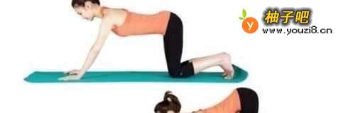 3. 在伸展的状态下呼吸4-5次,在最后呼气的同时慢慢回到开始姿势并将背部略拱起,然后回到第1步的姿势,继续运动。共反复3组。