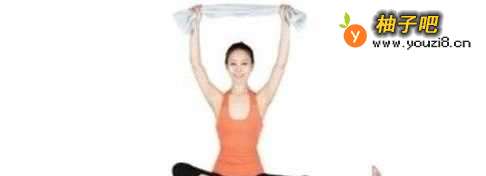 1. 臀部贴在地上坐好。弯曲右腿,将左腿向身体左侧伸出,膝盖伸直,脚尖朝上。双手抓住毛巾的两端将毛巾拉直,双手距离比肩膀略宽,腰部在伸直的状态下,将双臂向头上方伸直,目视正前方做开始姿势。