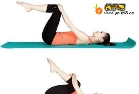 2. 呼气,双手抱膝将膝盖向胸部方向拉。这个时候抬起臀部离开地面,要尽最大可能去抬起臀部。深呼吸,在用力将膝盖向胸部拉的状态下保持住姿势,然后慢慢回到开始姿势。共反复5组。