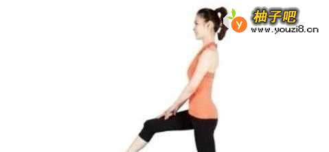 2. 呼气,身体重心向前方腿的位置移动。呼吸2-3次后,骨盆向前伸展,尽最大可能打开骨盆,在腹部用力,预防骨盆扭转。呼气的同时慢慢回到开始姿势。共反复3-5组。