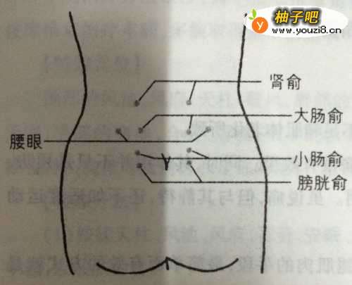 (1)肾俞穴:第二腰椎棘突下,左右约1.5寸(约两指宽)。或者沿肋骨下缘,画一水平线,跟腰椎交叉处,左右两侧约1.5寸。