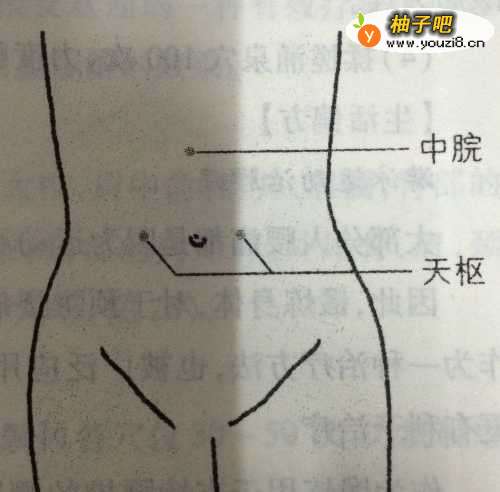 2按揉 腹部的中脘穴、天枢穴各50次,力度柔和。