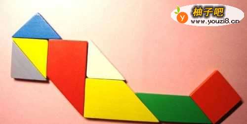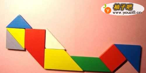 6最后,取蓝色的大三角形板与红色的正方形板连接,拼接位置,如下图所示。这样行走的小蛇图形就拼好了。可以让孩子仔细看一遍后,自己动手拼图,并不断回忆拼图的顺序,这可以锻炼孩子的记忆能力。培养孩子的过目不忘的能力,对孩子以后的学习有帮助。