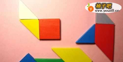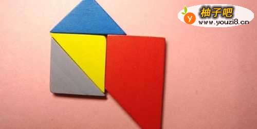 4然后,把白色的三角形板与橘色的梯形板连接,并摆放在红色梯形板的右边,拼接位置,如下图所示。