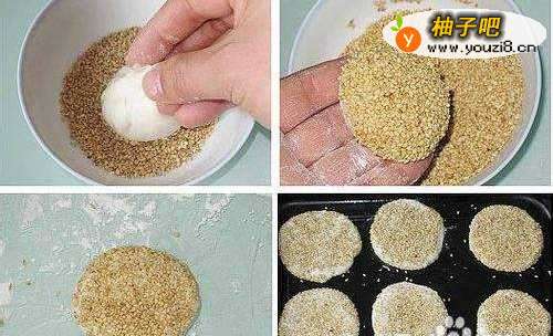 3把面皮连同8克的小剂子包起来,面团上沾点水后再沾芝麻;.把面团再摁扁后擀圆,放入烤盘里;烤箱预热220度,烤10分钟就可以了。(没有烤箱的可以用平底锅)