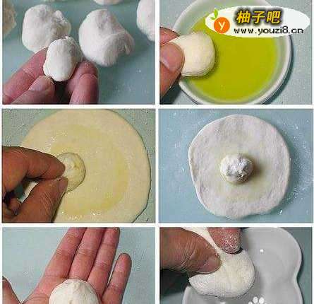 2取一个小剂子,摁扁;.取一个8克左右的小剂子,沾上油,在面皮中央涂上油,四周一圈不能涂油;