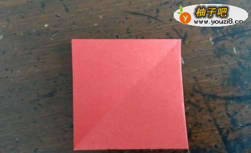 取一张正方形的彩纸,我们先把彩纸的对角线对折一下,如图。