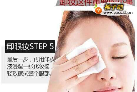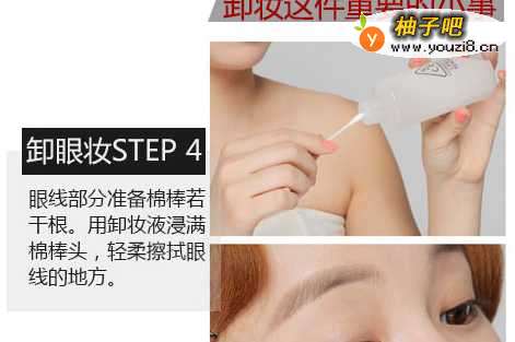 8Step 4:眼线部分准备棉棒若干根。用卸妆液浸满棉棒头,轻柔擦拭眼线的地方。最后一步,再用卸妆液浸湿一张化妆棉,轻敷擦拭整个眼部。需要提醒的是,眉妆是属于眼妆部分的,所以眉毛上也要使用到眼唇卸妆产品。