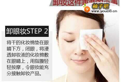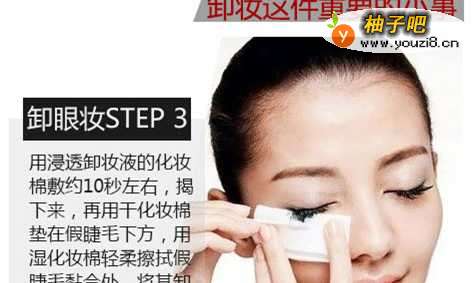 干化妆棉垫在眼下是避免妆容溶解后重新沾在下眼皮处,导致下眼皮有色素沉着;用卸妆液充分溶解彩妆以及假睫毛胶水再卸下,是为了卸假睫毛的时候不会撕扯到眼皮。对于比较难卸的内眼线,可以参照画眼线的方式:眼下放一面镜子,眼睛往下望,用指腹轻轻拉起眼皮,擦除眼线。内眼角的地方也要注意到。