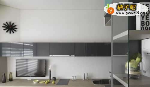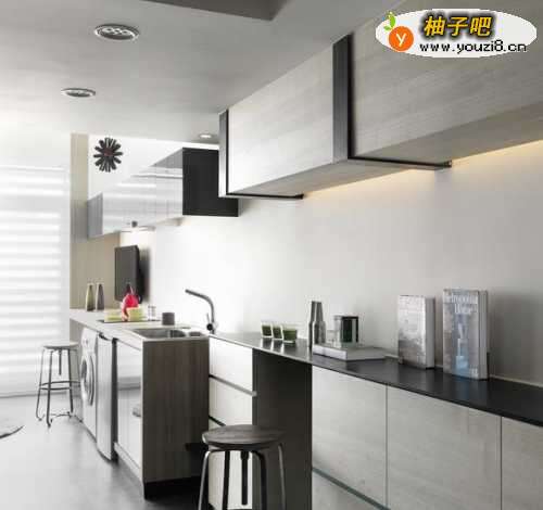 7灰、白色系的利落画面,设计师林宇崴刻意于烹调区上方埋入薄型抽油烟机,用细节体现完美设计。