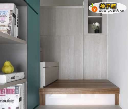 3简单线条塑造而出收纳柜体,整合入阅读、烹调甚至洗衣功能,而木作的上吊柜,实则作为上方睡眠区棉被等大型置物使用。