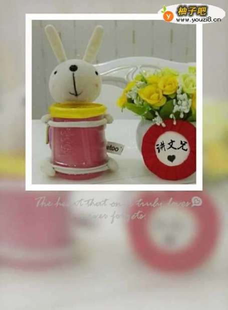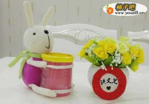 10把半截饮料瓶放进兔兔手脚和布条连接撑得两个环内!兔兔就把饮料瓶给抱住了!看,一个公仔笔筒诞生了,是不是很好看!