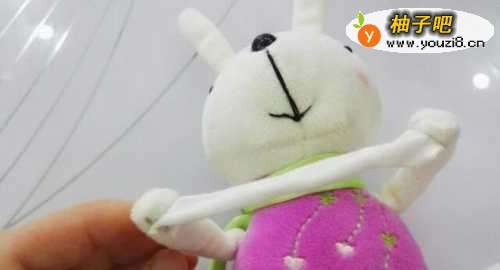 9把长的那根布条的两端分别缝在兔兔两只手的顶端!把兔兔的两只手也连接起来!