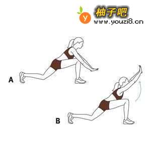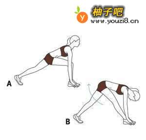 A.将右脚向前踩并弓步成90度,将手指放在地板上,或者双手伸直放在地上。