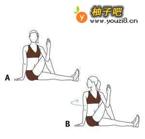 B.扭动时呼吸,将手臂按入腿中并看着右肩。屏住五口气,然后慢慢回到中间。