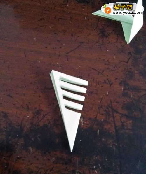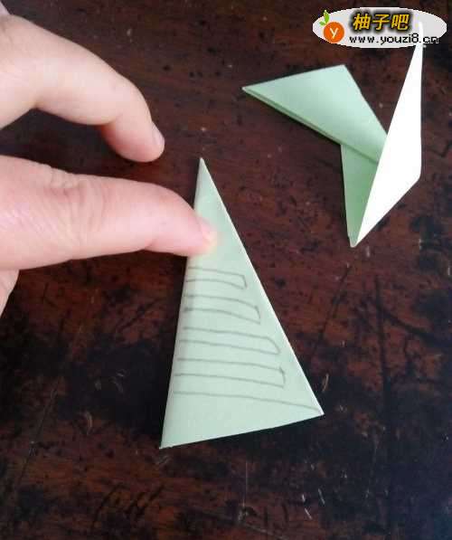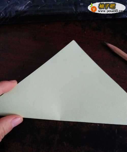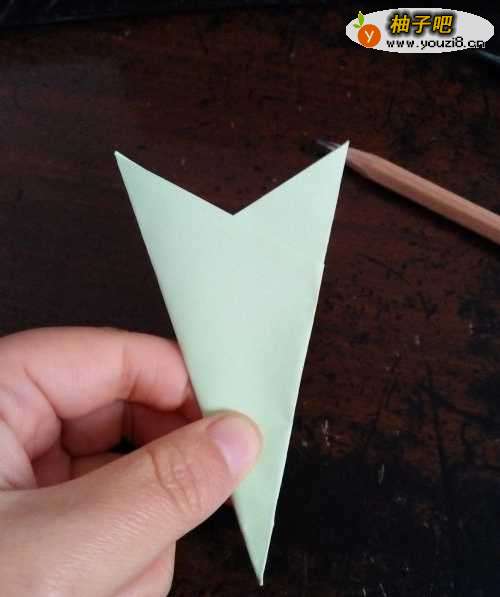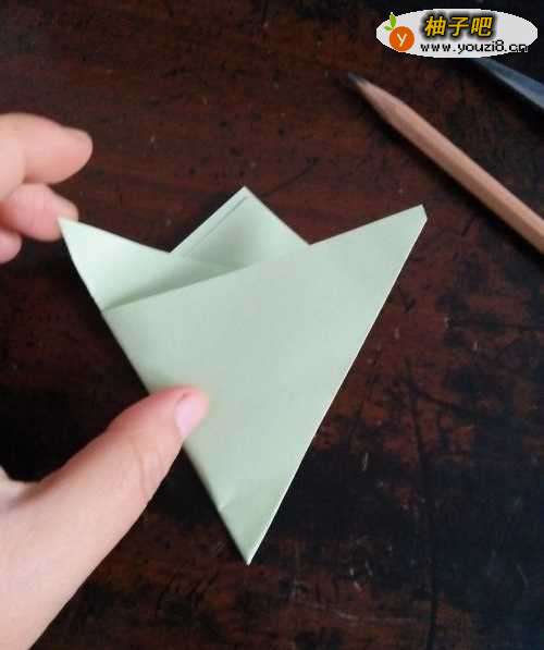 3我们把彩纸的上部三等分,以底边的中点为轴,把左右两边向另一方向对折。如图。