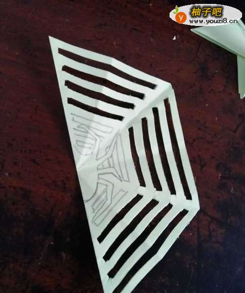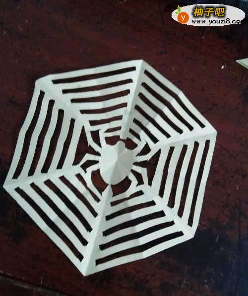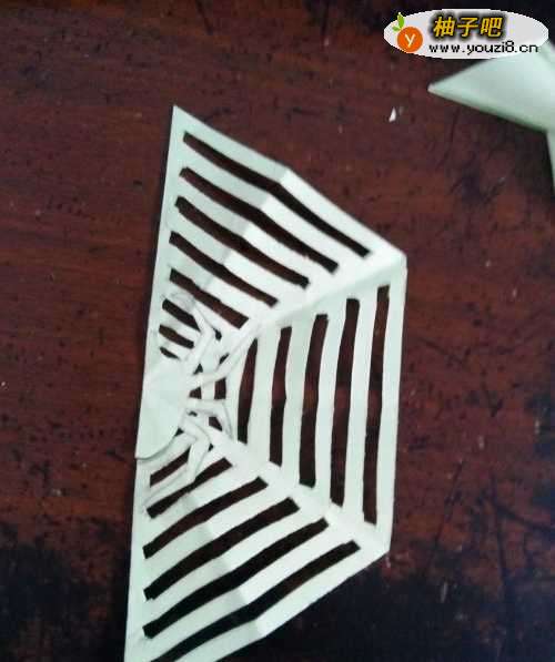 7不要完全打开,我们还要在剪好的纸上继续画上蜘蛛的图样。